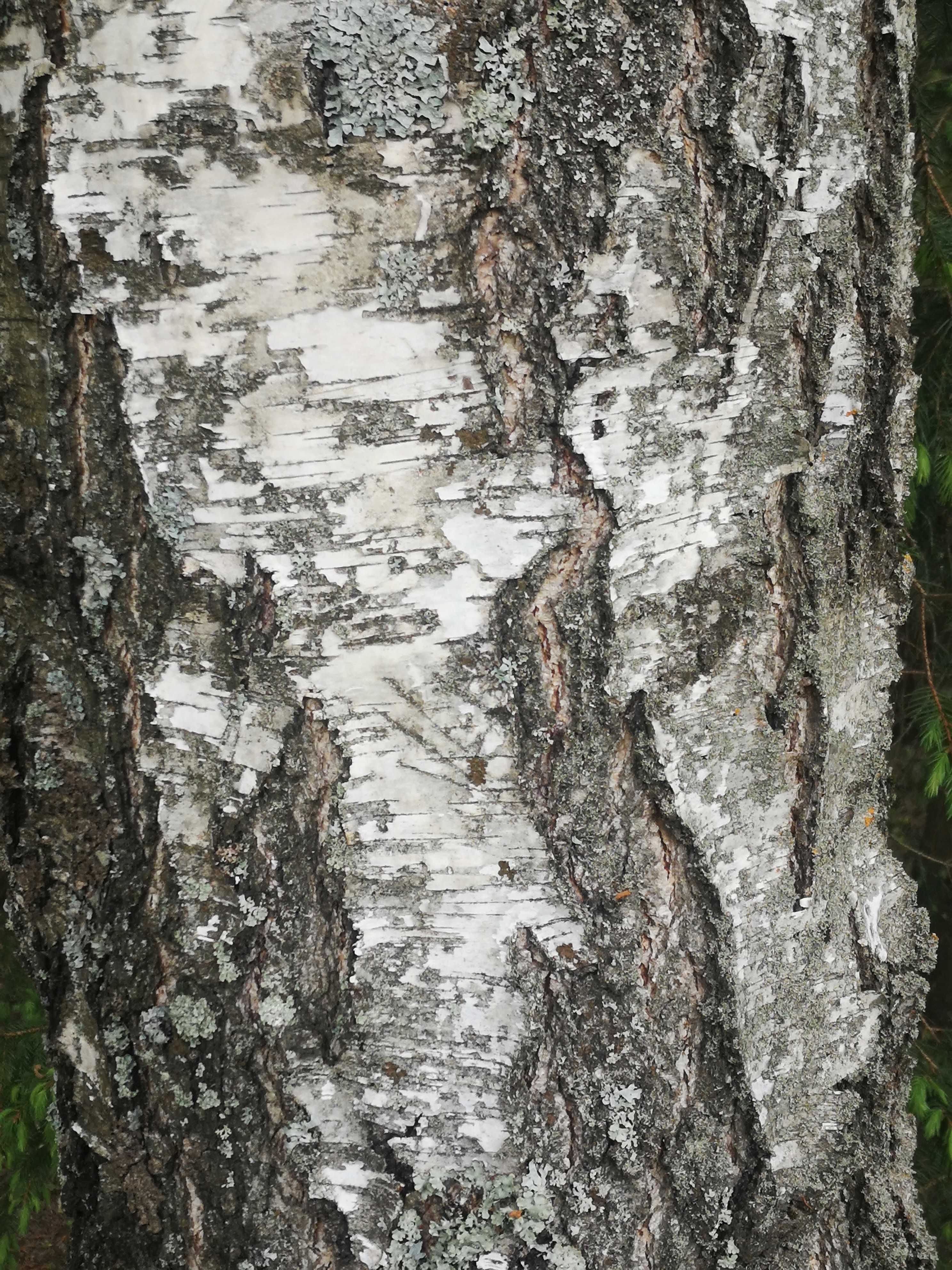 balta, su tamsiomis horizontaliomis lenticelėmis, apatinėje kamieno dalyje ir