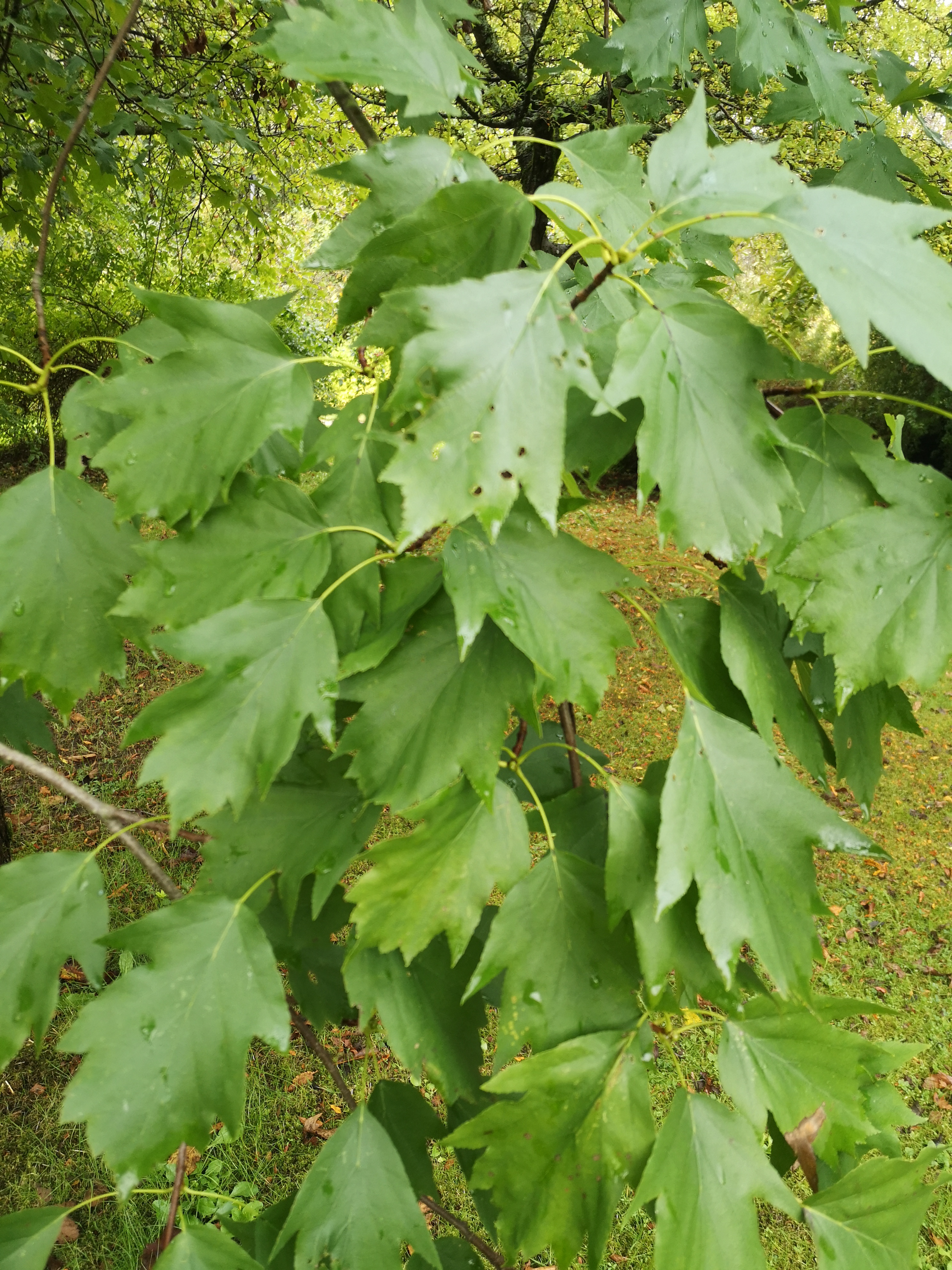 slyvų žievės tekstūrą. Lapai kiaušiniški, 6–14 cm ilgio, skiautėti 3–5